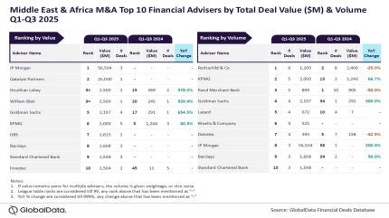 JP Morgan and Rothschild & Co have emerged as the top mergers and acquisitions (M&A) financial advisers in the Middle East & African (MEA) region during the first three quarters (Q1-Q3) of 2025 by value and volume, respectively.